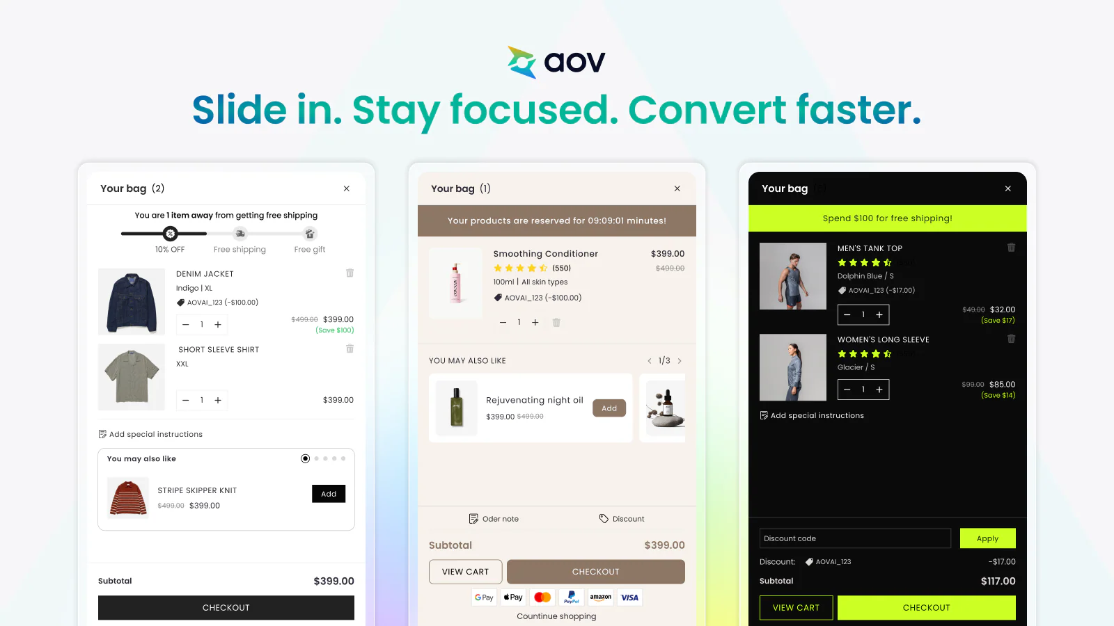 One pattern that consistently drives results: the three-incentive stack. Free shipping progress bar at the top of the drawer. One targeted upsell below the cart items. Sticky checkout button at the bottom. This configuration reliably lifts AOV by 15–25% without cluttering the cart experience.