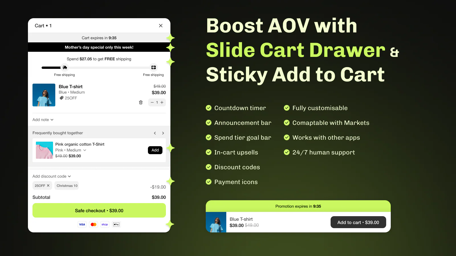 Best For: Stores that want BOGO, free gift, and urgency mechanics inside the cart drawer without installing separate apps.